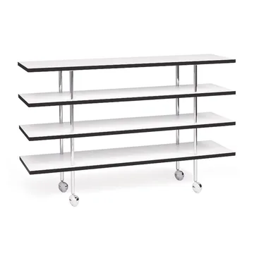 Mi 1150 avlastningsbord med hjul från Bruno Mathsson International är ett funktionellt etagebord formgivet av Bruno Mathsson med fyra hyllplan och lättmanövrerade hjul. Det enkla, genomtänkta uttrycket och de raka linjerna gör bordet till en tidlös förvaringslösning i vardagsrum, kök eller hall. Hyllplanen mäter 120×36 cm, avståndet från kortsida till rör är 23 cm och hyllavståndet är 16 cm vilket ger god överblick och praktisk åtkomst till förvaring. Perfekt som serveringsvagn, sidobord eller organiserad avlastningsyta.