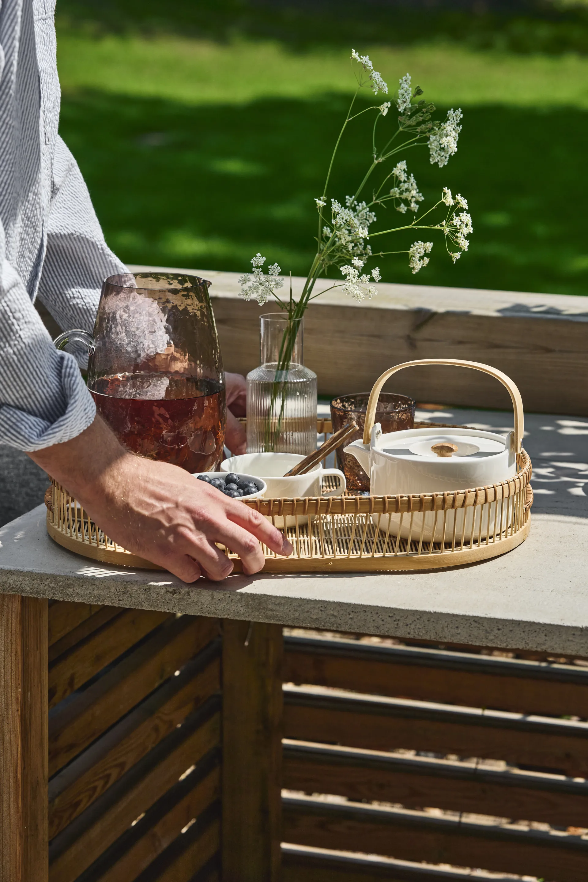 Ripple small karaff set från Ferm Living är ett vackert och genomtänkt set med en liten karaff och ett matchande glas som även fungerar som lock. Formgivningen i munblåst glas från kollektionen Ripple ger en mjuk, rytmisk yta som fångar ljuset och lyfter bordet vid både vardagsmåltider och fest. Karaffen rymmer 0,5 liter och glaset 20 cl — perfekt för vatten, saft eller en kall dryck vid dukningen. En fin detalj att ha framme på bordet eller i kökshyllan.