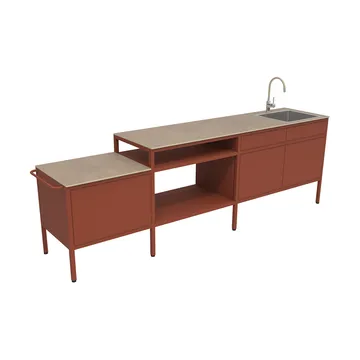 Goosto The Generous utekök med diskho från Fermob är ett rymligt och genomtänkt utekök som förvandlar matlagning utomhus till en njutning. Den eleganta aluminiumkonstruktionen är hållbar året runt och tål väder och vind, samtidigt som designen känns ren och modern utan synliga skruvar. Den gedigna bänkskivan i HPL och den rostfria diskhon gör det enkelt att förbereda och servera mat, medan smidiga lådor och förvaringsutrymmen håller ordning på köksredskapen. Med justerbara ben och möjlighet att koppla till både vattenledning eller trädgårdsslang är uteköket både flexibelt och praktiskt. Ett stilfullt och funktionellt tillskott till hemmet som inspirerar till samvaro och utomhusmatlagning.