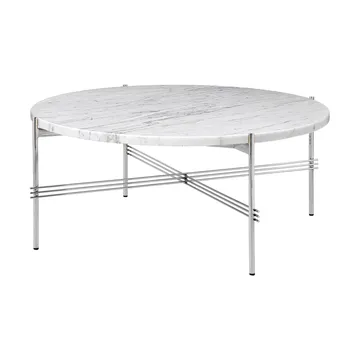 TS soffbord i polerat stål Ø80 från Gubi är ett stort soffbord med stenskiva. Designduon GamFratesi står bakom den sofistikerade designen som adderar en skulptural känsla till din inredning med sitt nätta krysstativ i polerat stål kombinerat med den runda skivan i massiv marmor eller travertin.