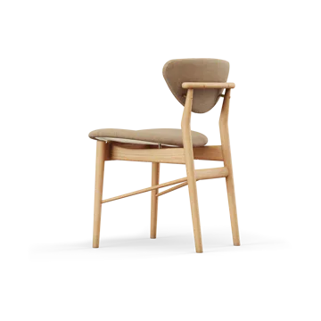 108 Chair stol från House of Finn Juhl är en uttrycksfull designstol som fångar uppmärksamheten med sina vinklade sidostänger och glidande tvärstänger. Tillverkad i massivt trä och formgiven för att skapa rörelse i rummet, erbjuder stolen både estetisk närvaro och god sittkomfort. Den finns i ek, valnöt eller svartlackerad finish och kan kläs i textil eller läder, vilket gör den lämplig i såväl matrum som läshörna. En tidlös möbel för den som vill ha karakter och hantverk i hemmet.