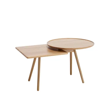 Mopsy bord från Karl Andersson & Söner är ett flexibelt soffbord formgivet av Markus Johansson med överlappande skivkombinationer på samma benstativ i olika höjder. Den lekfulla mixen av rund och kvadratisk form ger liv åt vardagsrummet och möjliggör gruppställning för ett personligt uttryck. Bordsskivor och benstativ är i massivt trä vilket ger robust kvalitet och tydlig träkänsla. Finns i ek, björk och ask samt i standardbetser på ask; vid standardfärger tillverkas bordsskivan i MDF. Perfekt som samlingspunkt vid soffan.