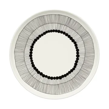 Tallriken Siirtolapuutarha från Marimekko är formgiven av Maija Louekari och har ett mönster inspirerat av växtligheten i kolonilotten. Själva tallriken är formgiven av Sami Ruotsalainen och heter Oiva utan dekor. Matcha gärna med tallrikar och skålar med Räsymatto-mönstret, de ingår nämligen i samma serie.