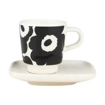 Unikko espresso kopp med fat 2-delar från Marimekko är ett elegant set för vardagens bästa kaffestund. Det vita porslinet i Oiva Unikko-kollektionen pryds av det ikoniska blomstermönstret skapat av Maija Isola, med formgivning av koppen av Sami Ruotsalainen. Setet består av en espressokopp med matchande litet fat och är praktiskt diskmaskins-, ugns-, mikro- och fryssäkert. Perfekt för espresso, macchiato eller en liten dessertservering. Tidlös nordisk design och funktion i ett set som förhöjer dukningen varje dag.