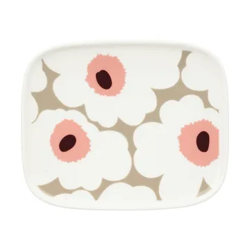 Unikko tallrik 12x15 cm från Marimekko är en rektangulär assiett prydd med det ikoniska Unikko-mönstret, formgivet av Maija Isola. Tillverkad i slitstarkt stengods passar den vardagsbruk och speciella tillfällen lika bra — tål diskmaskin, ugn, mikrovågsugn och frys vilket gör den extra praktisk i köket. Den enkla formen och det starka mönstret gör tallriken perfekt för servering av smårätter, bakverk eller som en dekorativ detalj på bordet som lyfter fram maten. Ta bort klistermärket från botten före användning.