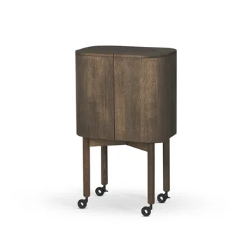 Loud barskåp på hjul från Northern är ett iögonfallande skåp formgivet av Färg & Blanche. Med släta konturer och en kropp klädd i polerad aluminiumlaminat skapas en bländande spegeleffekt som fångar blicken, medan bordsskivan och benen i rökt ek ger värme och karaktär. Skåpet står på metallhjul vilket gör det enkelt att flytta vid dukning eller när du vill förändra rummet. Ett självsäkert, funktionellt inslag i hemmet som kombinerar formgivning och användbarhet — perfekt för den som söker ett starkt och personligt uttryck.