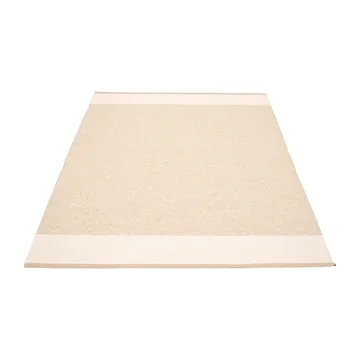 Edit plastmatta 140x200 cm från svenska Pappelina är tillverkad av ftalatfri plast med en insydd logotyp på ena sidan. Den stora mattan passar lika bra i hallen som på altanen då den är både en inomhus- och utomhusmatta.