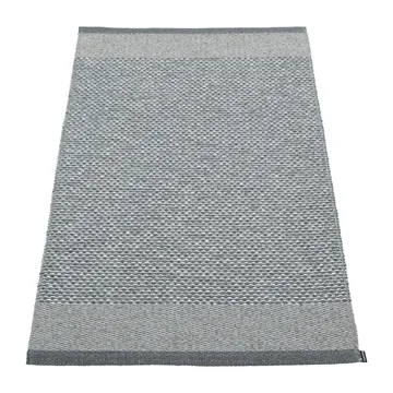 Edit plastmatta 70x120 cm från svenska Pappelina är tillverkad av ftalatfri plast med en insydd logotyp på ena sidan. Den lilla gångmattan passar lika bra i hallen som på den lilla balkongen då den är både en inomhus- och utomhusmatta.