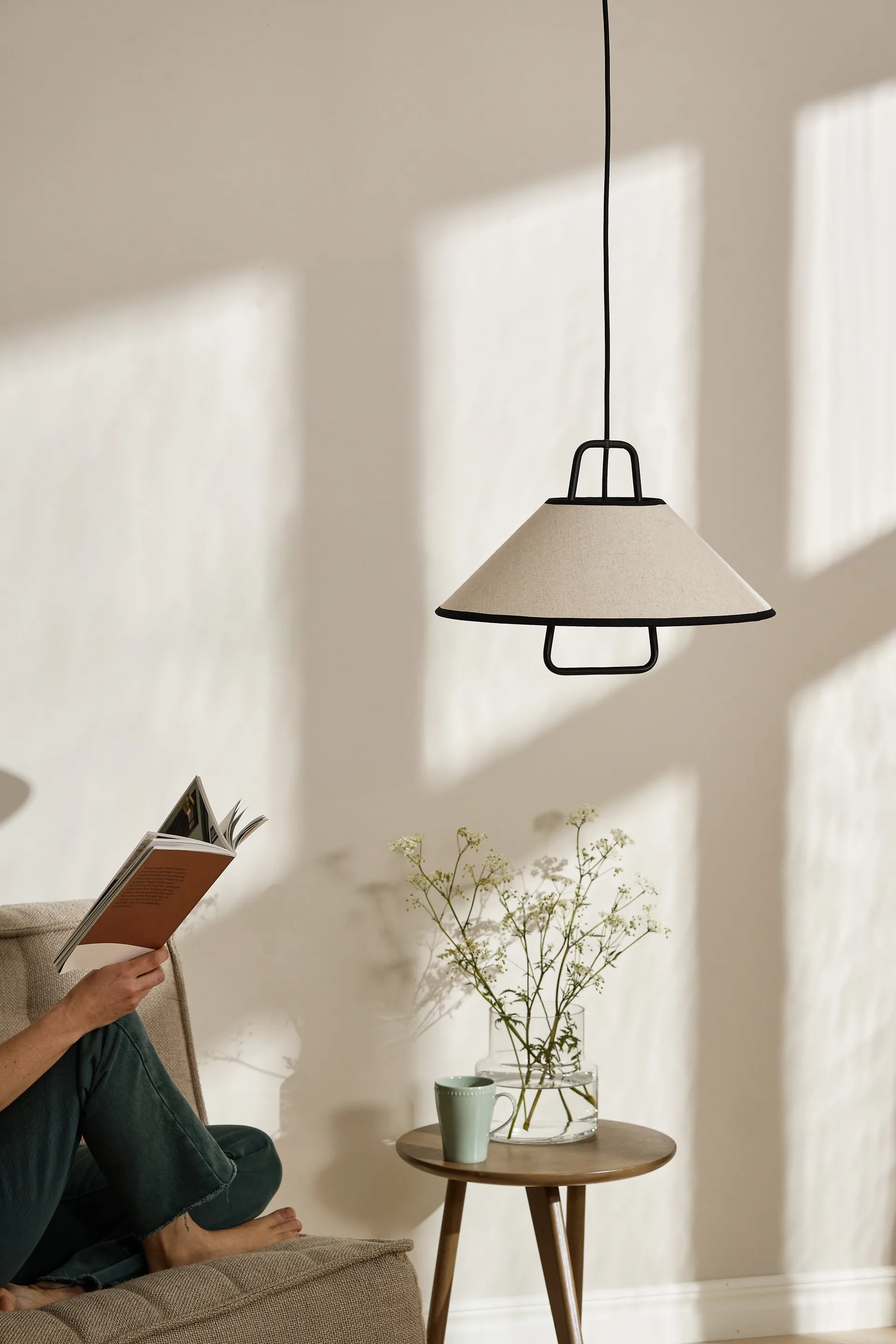 Moss pendel Ø42 cm av Scandi Living har en metallbas som bär upp en linneskärm med sydda kanter. Formen är inspirerad av retrostil i harmonisk kombination med japandiuttryck och enkelhet i kontraster. Lampan sprider ett varmt, behagligt ljus som skapar en inbjudande atmosfär. Perfekt över matbordet, i vardagsrummet eller sovrummet där den både fungerar som stämningsfull belysning och en stilfull inredningsdetalj.
