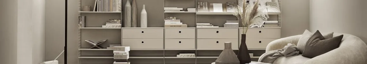 Den första Stringhyllan designades med syfte att rymma böcker i vardagsrummet, nära till hands i läsfåtöljen. Självklart kan du fortfarande bygga en klassisk Stringhylla till vardagsrummet, men du kan också bygga en TV-bänk till din TV med förvaring för kanalboxen eller TV-spelet. Eller varför inte fylla hyllan med souvenirer från dina bästa resor eller dina finaste inredningsdetaljer?