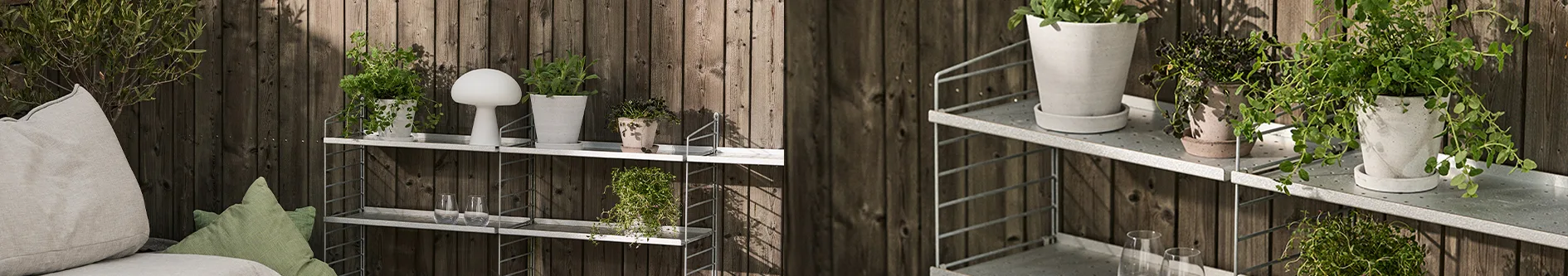 Stringhyllan passar in i hemmets alla rum, även i uterummet. String Outdoor är tillverkad i galvaniserat stål för att klara av att stå emot väder och vind utomhus. String Outdoor öppnar upp för trädgårdsförvaring på ett helt nytt spännande sätt. Där du helt enkelt får möjligheten att inreda din uteplats med ett vackert och tidlöst hyllsystem.