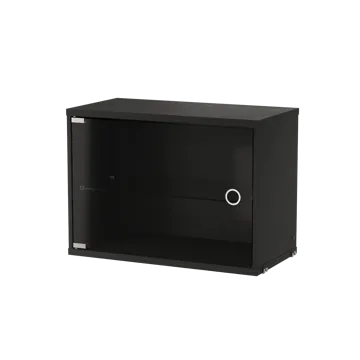 String vitrinskåp 58 cm har skjutbara glasdörrar, aluminiumhandtag och hyllplan i härdat glas. Det passar till String gavel med 30 cm djup och kan hängas direkt på gavlarna.