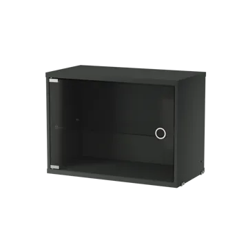 String vitrinskåp 58 cm har skjutbara glasdörrar, aluminiumhandtag och hyllplan i härdat glas. Det passar till String gavel med 30 cm djup och kan hängas direkt på gavlarna.