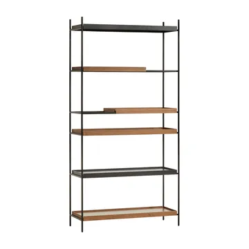 Tray hylla hög valnöt, 100x201 cm från danska Woud är en öppen bokhylla med sex hyllplan i olika storlekar formgiven av Hanne Willmann. Den höga hyllan har en estetisk symmetri med raka linjer och är formgiven för att passa just dig. Välj själv din favoritkombination genom att placera brickorna på någon av de olika nivåerna i ramen. Hyllan har små hyllplan som möjliggör att högre föremål som en vacker vas får ta plats.