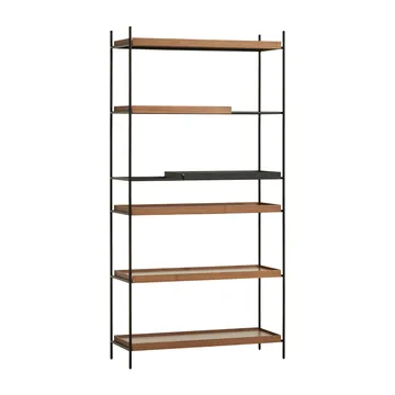 Tray hylla hög valnöt, 100x201 cm från danska Woud är en öppen bokhylla med sex hyllplan i olika storlekar formgiven av Hanne Willmann. Den höga hyllan har en estetisk symmetri med raka linjer och är formgiven för att passa just dig. Välj själv din favoritkombination genom att placera brickorna på någon av de olika nivåerna i ramen. Hyllan har små hyllplan som möjliggör att högre föremål som en vacker vas får ta plats.